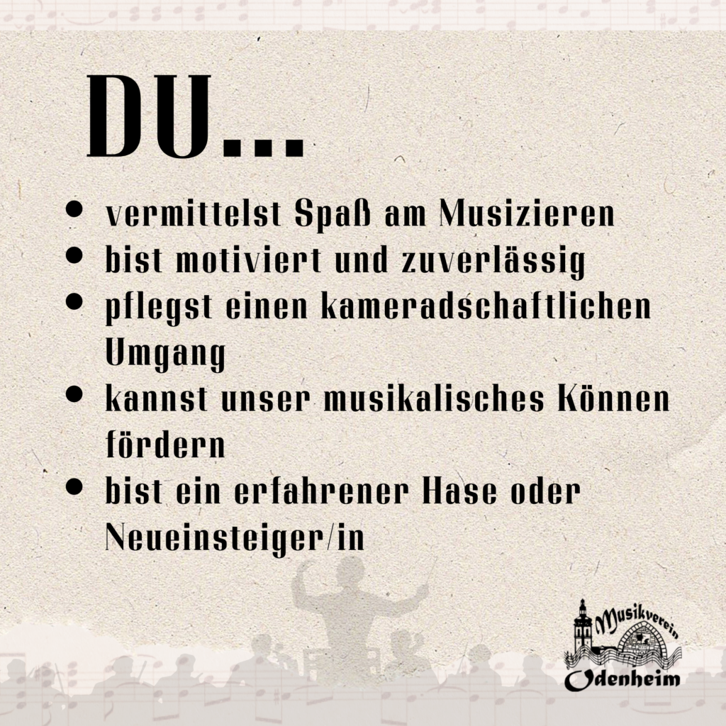 Du kannst dir vorstellen, mit uns gemeinsam Musik zu machen und den Musikverein Odenheim in die Zukunft zu führen? Dann freuen wir uns sehr darauf, dich kennenzulernen!