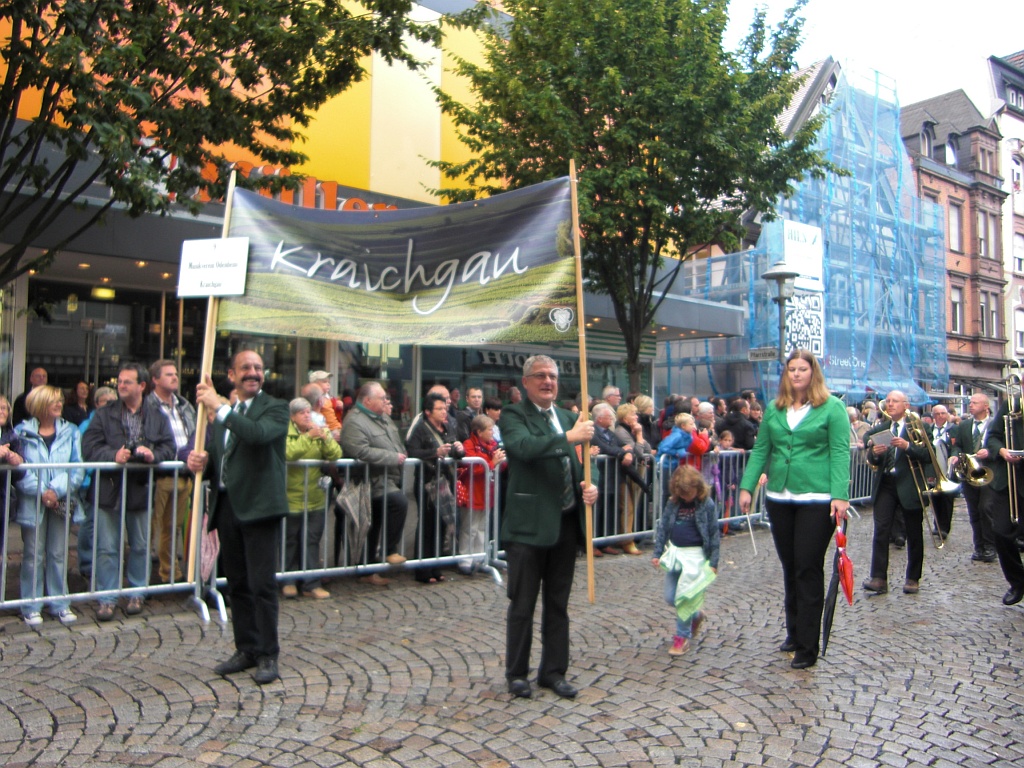Am Sonntag, den 15. September, spielten wir unter dem Banner der Weinbauregion Kraichgau beim Festumzug anlässlich des 100. Jubiläums des Badischen Weinbauverbandes. Dieser runde Geburtstag des badischen Weins war auch der Anlass, warum die Wahl zur Deutschen Weinkönigin dort stattfand.