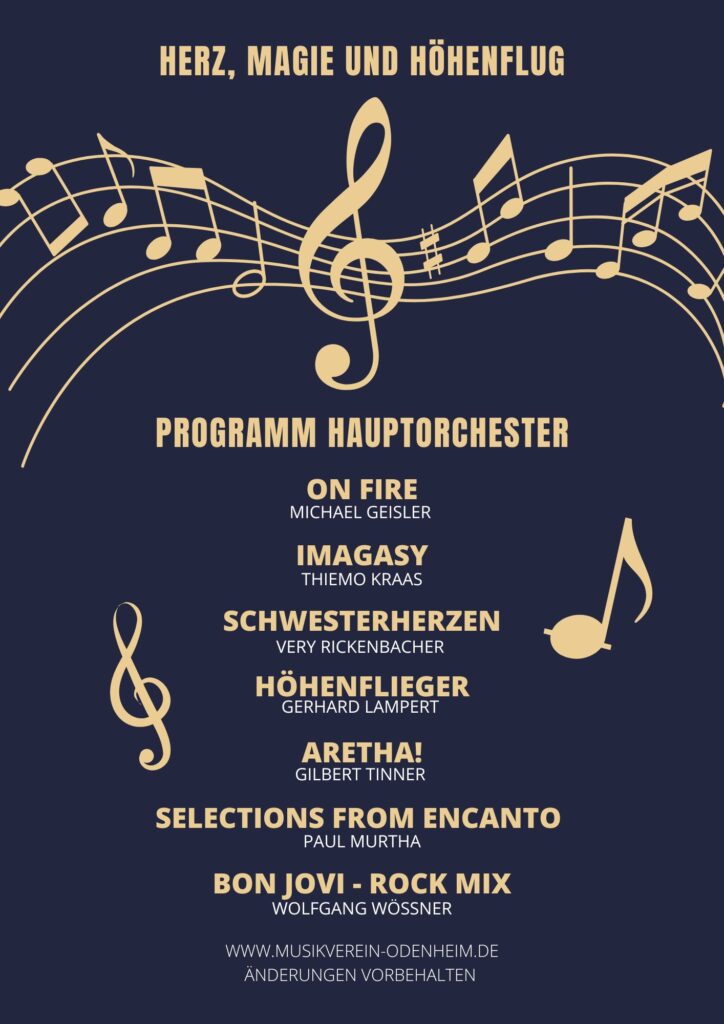 Im Anschluss nimmt das Große Blasorchester, dirigiert von Corinna Meixner, Carolin Stier und Yannick Dewald, das Publikum mit auf eine klangvolle Reise. Von feurigen Rhythmen und fantasievollen Klangbildern über gefühlvolle Melodien bis hin zu rockigen Klassikern ist für jeden Geschmack etwas dabei. Werke wie „On Fire“, „Imagasy“ und „Schwesterherzen“ entfachen Emotion und Magie, während „Höhenflieger“ musikalisch die Leichtigkeit des Abhebens spüren lässt. Spätestens bei „Aretha!“ grooven die Zuhörerinnen und Zuhörer mit, wenn der unverwechselbare Soul von Aretha Franklin erklingt. Mit Musik aus Disneys „Encanto“ wird es farbenfroh und schwungvoll, bevor der „Bon Jovi – Rock Mix“ den Abend mit echter Gänsehautstimmung beschließt.